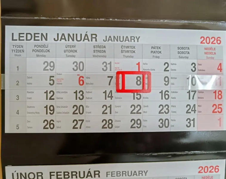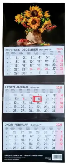 Klasický trojdílný kalendář značky O-Press pro rok 2026 je ideálním řešením pro kancelář, firmu, pracovnu i pro domácí použití. Díky velkému formátu 308 x 710 x 4 mm je kalendárium dobře viditelné z dálky a přehledné uspořádání usnadňuje plánování celého měsíce předem.
