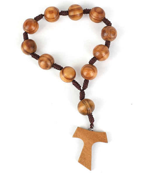 Dřevěný růženec desátek s velkými korálky o průměru 1,5 cm a dřevěným křížem Tau o velikosti 4 cm.