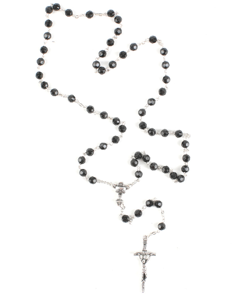 Jednoduchý růženec s černými skleněnými korálky a stříbrným křížkem.