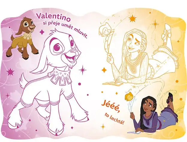Omalovánky obsahují 24 originálně tvarovaných stran s barevnou předlohou a 50 samolepek k ozdobení.